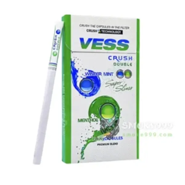 Vess Menthol (2 เม็ดบีบ) VESS CRUSH DOUBLE SUPER SLIMS บุหรี่เย็นรุ่นพิเศษที่มาพร้อม 2 เม็ดบีบในมวนเดียว ให้กลิ่นหอมสดชื่นของมิ้นท์และเมนทอล เย็นจัดเต็ม รสนุ่มลงตัว ผสานกับใบยาคุณภาพที่แน่นและมอดช้ากว่าบุหรี่สลิมทั่วไป สัมผัสประสบการณ์การสูบที่ผ่อนคลายและยาวนานได้อย่างสมบูรณ์แบบ